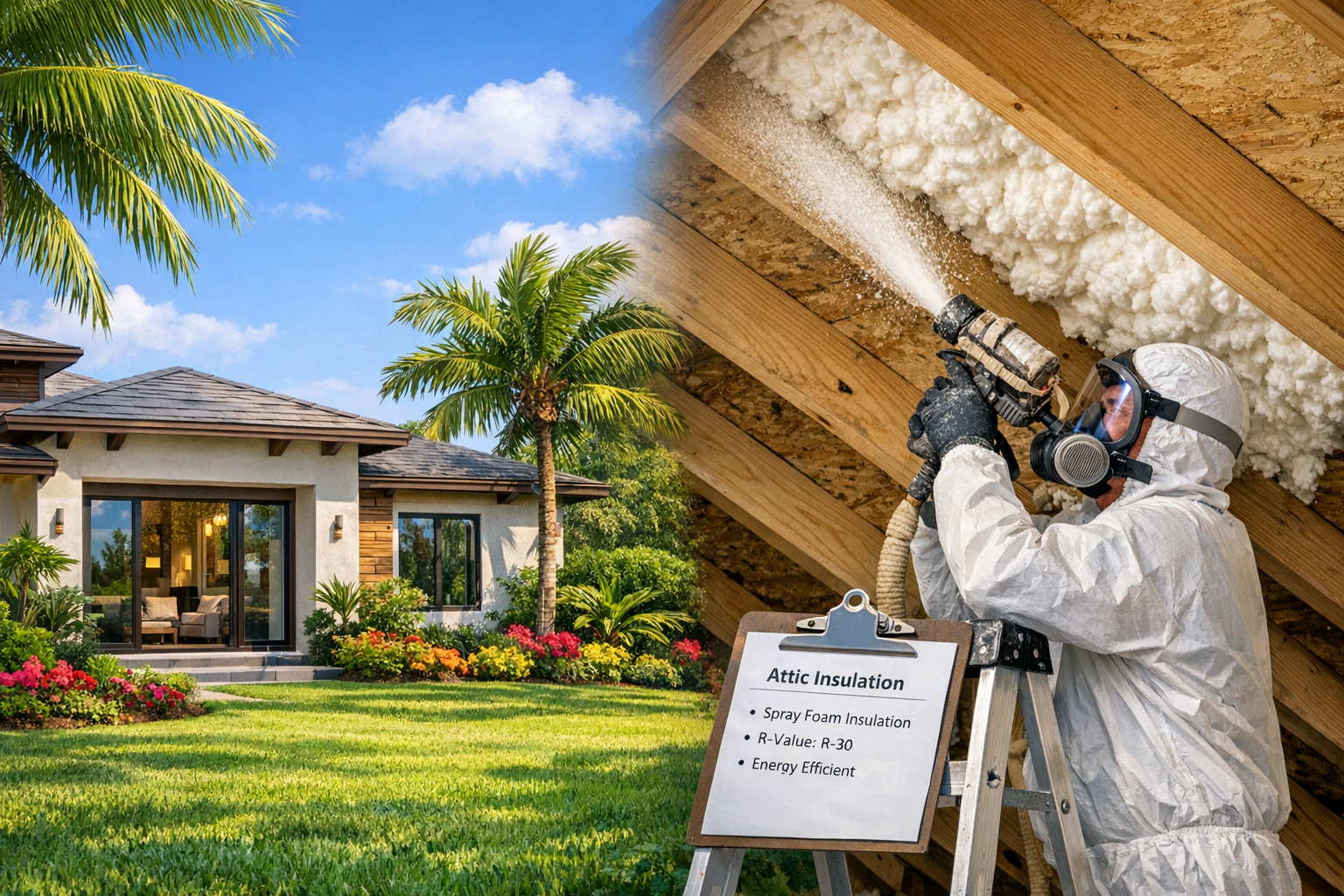 Naples sits in IECC Climate Zone 1. Under the Florida Building Code (FBC 8th Edition, 2023), a vented attic requires minimum R-30 insulation. But here's what most homeowners don't know: if you go with spray foam in an unvented attic assembly, FBC Section R806.5 allows R-20 — as long as you hit less than 3 ACH50 on a blower door test and have mechanical ventilation.