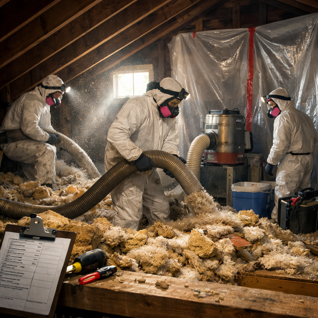 - Assessment: We inspect the attic or crawl space, identify the insulation type, check for hazards (asbestos in pre-1980 homes, mold, pests), and measure the area.